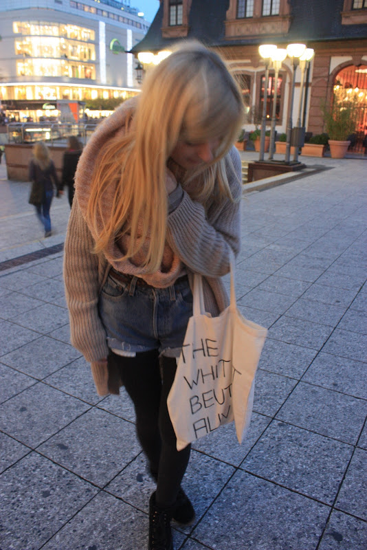 schönes outfit,besonders das strickzeug und die shorts sind cool.naja und der beutel natürlich auch.einfach das ganze outfit!